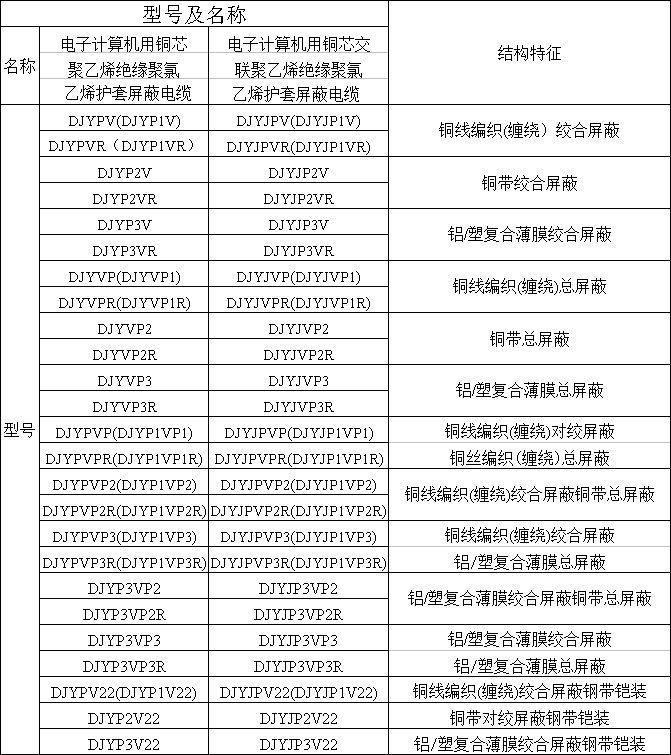 4.2.3 例: 电子计算机用铜芯聚乙烯绝缘聚氯乙烯护套编织总屏蔽电缆,额定电压500V,四芯(2对),2.5mm2,表示为:
