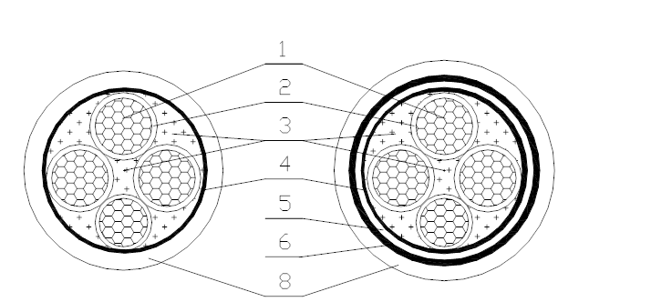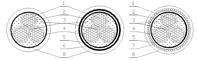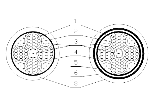 第四位:铠装层代号2—— 双钢带;3—— 细圆钢丝;4—— 粗圆钢丝;
