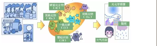 以一氧化氮和二氧化氮为主的氮氧化物是形成光化学烟雾和酸雨的一个重要原因.汽车尾气中的氮氧化物与碳氢化合物经紫外线照射发生反应形成的有毒烟雾,称为光化学烟雾.光化学烟雾具有特殊气味,刺激眼睛,伤害植物,并能使大气能见度降低.另外,氮氧化物与空气中的水反应生成的硝酸和亚硝酸是酸雨的成分.大气中的氮氧化物主要源于化石燃料的燃烧和植物体的焚烧,以及农田土壤和动物排泄物中含氮化合物的转化