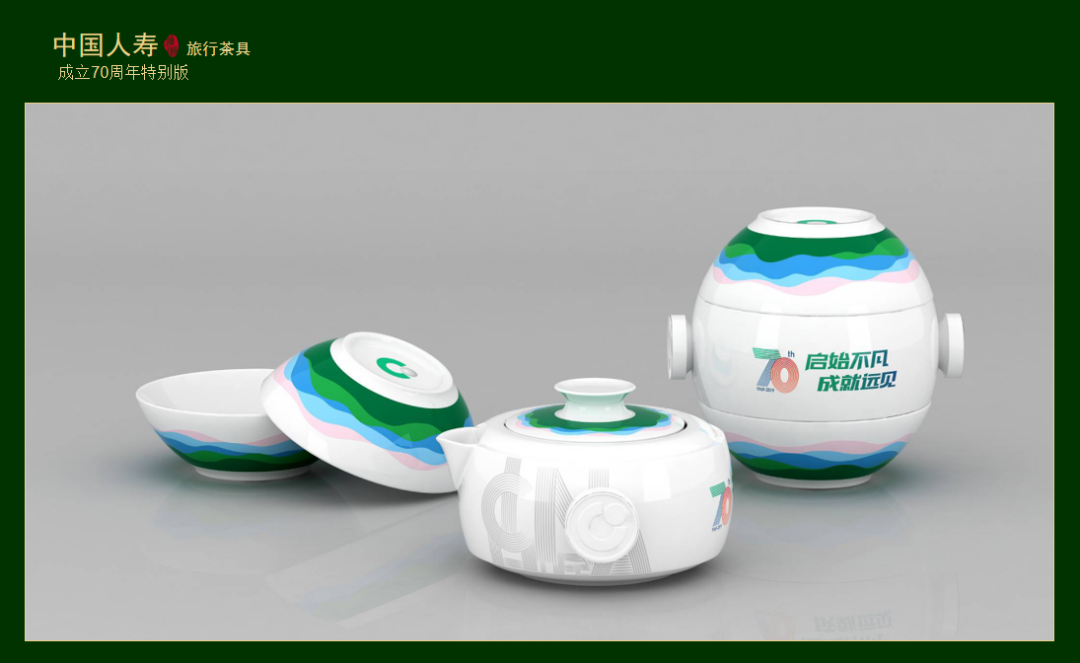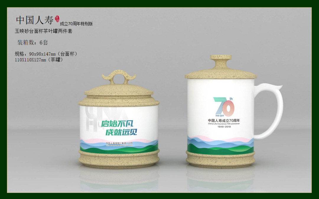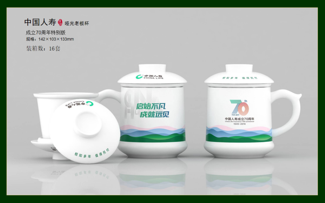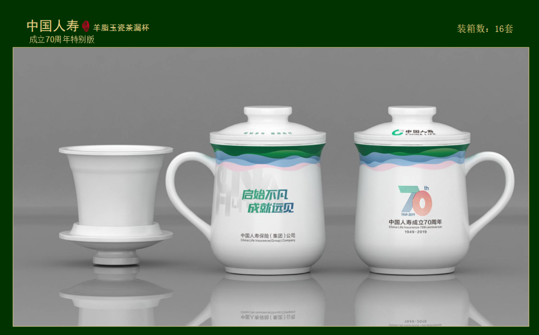 本系列瓷质为羊脂玉瓷,施珍珠丝光釉面,整体内敛、雅致、大气,手感温润。精心的结合人寿70周年元素进行的花面设计,在即将到来的中国人寿70岁生日系列活动中,必将增添一分节日的喜悦与期待。